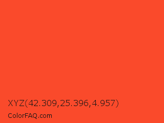 XYZ 42.309,25.396,4.957 Color is a normal red color and the nearest color is Pomegranate #f34723. Hex code #fa4a2b and RGB value is rgb(250,74,43). In RGB color space, this color is composed of 98% red, 29% green, 17% blue, In CMYK color space, this color is composed of 0% cyan, 70% magenta, 83% yellow , 2% black , In HSL color space, this color has a hue angle of 9° , 95% saturation and 57% lightness.