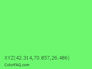 XYZ 42.314,70.857,26.486 Color is a light green color and the nearest color is Screamin Green #66ff66. Hex code #6cf76f and RGB value is rgb(108,247,111). In RGB color space, this color is composed of 42% red, 97% green, 44% blue, In CMYK color space, this color is composed of 56% cyan, 0% magenta, 55% yellow , 3% black , In HSL color space, this color has a hue angle of 121° , 90% saturation and 70% lightness.