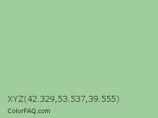 XYZ 42.329,53.537,39.555 Color is a light green color and the nearest color is Eton Blue #96c8a2. Hex code #a0cd9c and RGB value is rgb(160,205,156). In RGB color space, this color is composed of 63% red, 80% green, 61% blue, In CMYK color space, this color is composed of 22% cyan, 0% magenta, 24% yellow , 20% black , In HSL color space, this color has a hue angle of 115° , 33% saturation and 71% lightness.