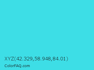 XYZ 42.329,58.948,84.01 Color is a normal cyan color and the nearest color is Turquoise #40e0d0. Hex code #3ddee6 and RGB value is rgb(61,222,230). In RGB color space, this color is composed of 24% red, 87% green, 90% blue, In CMYK color space, this color is composed of 73% cyan, 3% magenta, 0% yellow , 10% black , In HSL color space, this color has a hue angle of 183° , 77% saturation and 57% lightness.