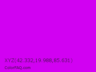 XYZ 42.332,19.988,85.631 Color is a normal magenta color and the nearest color is Vivid Orchid #cc00ff. Hex code #d101f2 and RGB value is rgb(209,1,242). In RGB color space, this color is composed of 82% red, 0% green, 95% blue, In CMYK color space, this color is composed of 14% cyan, 100% magenta, 0% yellow , 5% black , In HSL color space, this color has a hue angle of 292° , 99% saturation and 48% lightness.