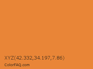 XYZ 42.332,34.197,7.86 Color is a normal orange color and the nearest color is Cadmium Orange #ed872d. Hex code #e88536 and RGB value is rgb(232,133,54). In RGB color space, this color is composed of 91% red, 52% green, 21% blue, In CMYK color space, this color is composed of 0% cyan, 43% magenta, 77% yellow , 9% black , In HSL color space, this color has a hue angle of 27° , 79% saturation and 56% lightness.