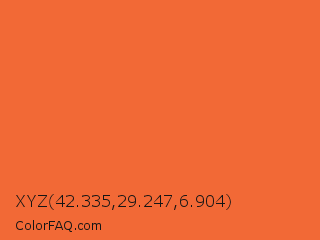 XYZ 42.335,29.247,6.904 Color is a normal orange color and the nearest color is Deep Carrot Orange #e9692c. Hex code #f26936 and RGB value is rgb(242,105,54). In RGB color space, this color is composed of 95% red, 41% green, 21% blue, In CMYK color space, this color is composed of 0% cyan, 57% magenta, 78% yellow , 5% black , In HSL color space, this color has a hue angle of 16° , 88% saturation and 58% lightness.