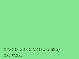 XYZ 42.337,62.847,35.886 Color is a light green color and the nearest color is Light Green #90ee90. Hex code #83e58f and RGB value is rgb(131,229,143). In RGB color space, this color is composed of 51% red, 90% green, 56% blue, In CMYK color space, this color is composed of 43% cyan, 0% magenta, 38% yellow , 10% black , In HSL color space, this color has a hue angle of 127° , 65% saturation and 71% lightness.