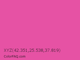 XYZ 42.351,25.538,37.819 Color is a light magenta color and the nearest color is Raspberry Pink #e25098. Hex code #e652a4 and RGB value is rgb(230,82,164). In RGB color space, this color is composed of 90% red, 32% green, 64% blue, In CMYK color space, this color is composed of 0% cyan, 64% magenta, 29% yellow , 10% black , In HSL color space, this color has a hue angle of 327° , 75% saturation and 61% lightness.