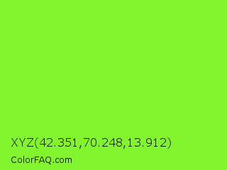 XYZ 42.351,70.248,13.912 Color is a normal green color and the nearest color is Spring Frost #87ff2a. Hex code #82f52e and RGB value is rgb(130,245,46). In RGB color space, this color is composed of 51% red, 96% green, 18% blue, In CMYK color space, this color is composed of 47% cyan, 0% magenta, 81% yellow , 4% black , In HSL color space, this color has a hue angle of 95° , 91% saturation and 57% lightness.