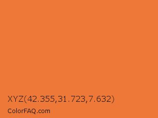 XYZ 42.355,31.723,7.632 Color is a normal orange color and the nearest color is Jaffa #ef863f. Hex code #ed7838 and RGB value is rgb(237,120,56). In RGB color space, this color is composed of 93% red, 47% green, 22% blue, In CMYK color space, this color is composed of 0% cyan, 49% magenta, 76% yellow , 7% black , In HSL color space, this color has a hue angle of 21° , 83% saturation and 57% lightness.