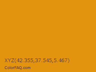 XYZ 42.355,37.545,5.467 Color is a normal orange color and the nearest color is Gamboge #e49b0f. Hex code #e3940f and RGB value is rgb(227,148,15). In RGB color space, this color is composed of 89% red, 58% green, 6% blue, In CMYK color space, this color is composed of 0% cyan, 35% magenta, 93% yellow , 11% black , In HSL color space, this color has a hue angle of 38° , 88% saturation and 47% lightness.