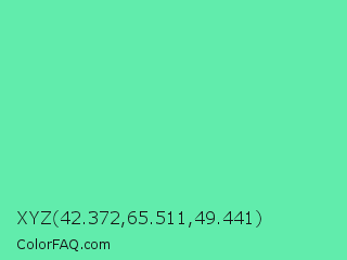 XYZ 42.372,65.511,49.441 Color is a light green color and the nearest color is Medium Aquamarine #66ddaa. Hex code #61ecac and RGB value is rgb(97,236,172). In RGB color space, this color is composed of 38% red, 93% green, 67% blue, In CMYK color space, this color is composed of 59% cyan, 0% magenta, 27% yellow , 7% black , In HSL color space, this color has a hue angle of 152° , 79% saturation and 65% lightness.