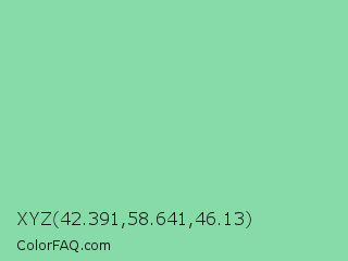 XYZ 42.391,58.641,46.13 Color is a light green color and the nearest color is Vista Blue #8fd6b4. Hex code #87dba8 and RGB value is rgb(135,219,168). In RGB color space, this color is composed of 53% red, 86% green, 66% blue, In CMYK color space, this color is composed of 38% cyan, 0% magenta, 23% yellow , 14% black , In HSL color space, this color has a hue angle of 144° , 54% saturation and 69% lightness.