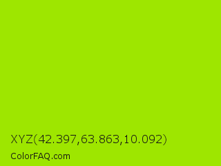 XYZ 42.397,63.863,10.092 Color is a normal lime color and the nearest color is Vivid Lime Green #a6d608. Hex code #9ee600 and RGB value is rgb(158,230,0). In RGB color space, this color is composed of 62% red, 90% green, 0% blue, In CMYK color space, this color is composed of 31% cyan, 0% magenta, 100% yellow , 10% black , In HSL color space, this color has a hue angle of 79° , 100% saturation and 45% lightness.