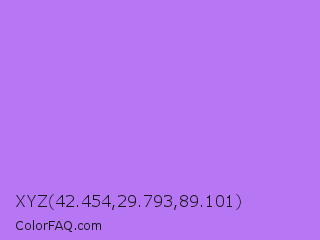 XYZ 42.454,29.793,89.101 Color is a light purple color and the nearest color is Lavender #b57edc. Hex code #b777f4 and RGB value is rgb(183,119,244). In RGB color space, this color is composed of 72% red, 47% green, 96% blue, In CMYK color space, this color is composed of 25% cyan, 51% magenta, 0% yellow , 4% black , In HSL color space, this color has a hue angle of 271° , 85% saturation and 71% lightness.