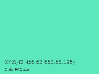 XYZ 42.456,63.663,58.195 Color is a light green color and the nearest color is Medium Aquamarine #66ddaa. Hex code #5ce8bd and RGB value is rgb(92,232,189). In RGB color space, this color is composed of 36% red, 91% green, 74% blue, In CMYK color space, this color is composed of 60% cyan, 0% magenta, 19% yellow , 9% black , In HSL color space, this color has a hue angle of 162° , 75% saturation and 64% lightness.