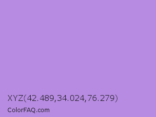 XYZ 42.489,34.024,76.279 Color is a light violet color and the nearest color is Bright Lavender #bf94e4. Hex code #b78be2 and RGB value is rgb(183,139,226). In RGB color space, this color is composed of 72% red, 55% green, 89% blue, In CMYK color space, this color is composed of 19% cyan, 38% magenta, 0% yellow , 11% black , In HSL color space, this color has a hue angle of 270° , 60% saturation and 72% lightness.