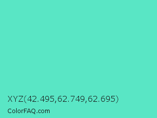 XYZ 42.495,62.749,62.695 Color is a light cyan color and the nearest color is Medium Turquoise #48d1cc. Hex code #59e6c5 and RGB value is rgb(89,230,197). In RGB color space, this color is composed of 35% red, 90% green, 77% blue, In CMYK color space, this color is composed of 61% cyan, 0% magenta, 14% yellow , 10% black , In HSL color space, this color has a hue angle of 166° , 74% saturation and 63% lightness.