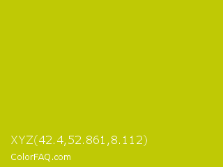 XYZ 42.4,52.861,8.112 Color is a normal yellow color and the nearest color is Rio Grande #bbd009. Hex code #bfc905 and RGB value is rgb(191,201,5). In RGB color space, this color is composed of 75% red, 79% green, 2% blue, In CMYK color space, this color is composed of 5% cyan, 0% magenta, 98% yellow , 21% black , In HSL color space, this color has a hue angle of 63° , 95% saturation and 40% lightness.