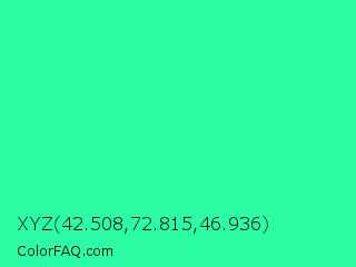 XYZ 42.508,72.815,46.936 Color is a normal green color and the nearest color is Medium Spring Green #00fa9a. Hex code #2bfca4 and RGB value is rgb(43,252,164). In RGB color space, this color is composed of 17% red, 99% green, 64% blue, In CMYK color space, this color is composed of 83% cyan, 0% magenta, 35% yellow , 1% black , In HSL color space, this color has a hue angle of 155° , 97% saturation and 58% lightness.