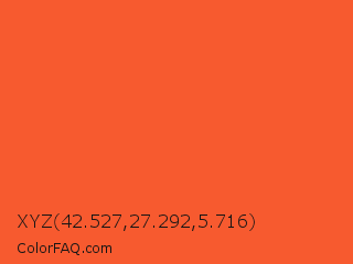 XYZ 42.527,27.292,5.716 Color is a normal red color and the nearest color is Flamingo #f2552a. Hex code #f75a2f and RGB value is rgb(247,90,47). In RGB color space, this color is composed of 97% red, 35% green, 18% blue, In CMYK color space, this color is composed of 0% cyan, 64% magenta, 81% yellow , 3% black , In HSL color space, this color has a hue angle of 13° , 93% saturation and 58% lightness.