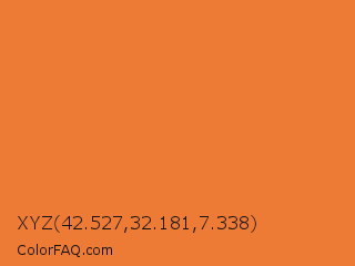 XYZ 42.527,32.181,7.338 Color is a normal orange color and the nearest color is Cadmium Orange #ed872d. Hex code #ed7a35 and RGB value is rgb(237,122,53). In RGB color space, this color is composed of 93% red, 48% green, 21% blue, In CMYK color space, this color is composed of 0% cyan, 49% magenta, 78% yellow , 7% black , In HSL color space, this color has a hue angle of 23° , 84% saturation and 57% lightness.