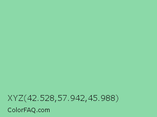 XYZ 42.528,57.942,45.988 Color is a light green color and the nearest color is Vista Blue #8fd6b4. Hex code #8bd9a8 and RGB value is rgb(139,217,168). In RGB color space, this color is composed of 55% red, 85% green, 66% blue, In CMYK color space, this color is composed of 36% cyan, 0% magenta, 23% yellow , 15% black , In HSL color space, this color has a hue angle of 142° , 51% saturation and 70% lightness.