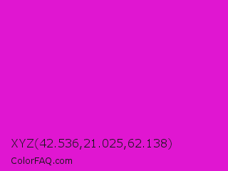 XYZ 42.536,21.025,62.138 Color is a normal magenta color and the nearest color is Deep Magenta #cc00cc. Hex code #e016d1 and RGB value is rgb(224,22,209). In RGB color space, this color is composed of 88% red, 9% green, 82% blue, In CMYK color space, this color is composed of 0% cyan, 90% magenta, 7% yellow , 12% black , In HSL color space, this color has a hue angle of 304° , 82% saturation and 48% lightness.