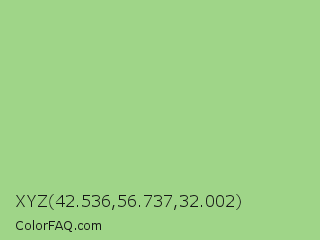 XYZ 42.536,56.737,32.002 Color is a light green color and the nearest color is Feijoa #9fdd8c. Hex code #9fd588 and RGB value is rgb(159,213,136). In RGB color space, this color is composed of 62% red, 84% green, 53% blue, In CMYK color space, this color is composed of 25% cyan, 0% magenta, 36% yellow , 16% black , In HSL color space, this color has a hue angle of 102° , 48% saturation and 68% lightness.