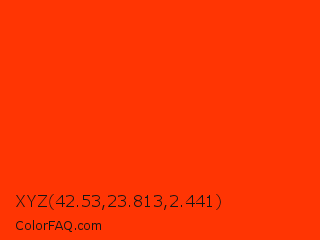 XYZ 42.53,23.813,2.441 Color is a normal red color and the nearest color is Coquelicot #ff3800. Hex code #ff3503 and RGB value is rgb(255,53,3). In RGB color space, this color is composed of 100% red, 21% green, 1% blue, In CMYK color space, this color is composed of 0% cyan, 79% magenta, 99% yellow , 0% black , In HSL color space, this color has a hue angle of 12° , 100% saturation and 51% lightness.