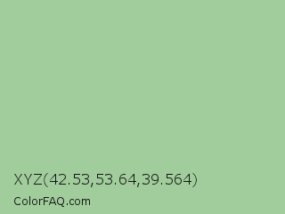 XYZ 42.53,53.64,39.564 Color is a light green color and the nearest color is Eton Blue #96c8a2. Hex code #a1cd9c and RGB value is rgb(161,205,156). In RGB color space, this color is composed of 63% red, 80% green, 61% blue, In CMYK color space, this color is composed of 21% cyan, 0% magenta, 24% yellow , 20% black , In HSL color space, this color has a hue angle of 114° , 33% saturation and 71% lightness.