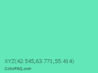 XYZ 42.545,63.771,55.414 Color is a light green color and the nearest color is Medium Aquamarine #66ddaa. Hex code #62e8b8 and RGB value is rgb(98,232,184). In RGB color space, this color is composed of 38% red, 91% green, 72% blue, In CMYK color space, this color is composed of 58% cyan, 0% magenta, 21% yellow , 9% black , In HSL color space, this color has a hue angle of 159° , 74% saturation and 65% lightness.
