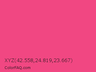 XYZ 42.558,24.819,23.667 Color is a light rose color and the nearest color is French Rose #f64a8a. Hex code #f14782 and RGB value is rgb(241,71,130). In RGB color space, this color is composed of 95% red, 28% green, 51% blue, In CMYK color space, this color is composed of 0% cyan, 71% magenta, 46% yellow , 5% black , In HSL color space, this color has a hue angle of 339° , 86% saturation and 61% lightness.