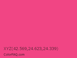 XYZ 42.569,24.623,24.339 Color is a light rose color and the nearest color is Violet Red #f7468a. Hex code #f14584 and RGB value is rgb(241,69,132). In RGB color space, this color is composed of 95% red, 27% green, 52% blue, In CMYK color space, this color is composed of 0% cyan, 71% magenta, 45% yellow , 5% black , In HSL color space, this color has a hue angle of 338° , 86% saturation and 61% lightness.