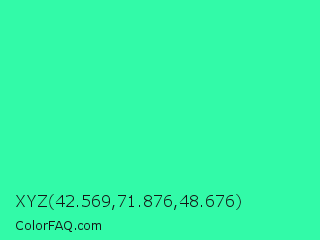 XYZ 42.569,71.876,48.676 Color is a normal green color and the nearest color is Eucalyptus #44d7a8. Hex code #32faa8 and RGB value is rgb(50,250,168). In RGB color space, this color is composed of 20% red, 98% green, 66% blue, In CMYK color space, this color is composed of 80% cyan, 0% magenta, 33% yellow , 2% black , In HSL color space, this color has a hue angle of 155° , 95% saturation and 59% lightness.