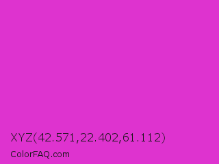 XYZ 42.571,22.402,61.112 Color is a normal magenta color and the nearest color is Steel Pink #cc33cc. Hex code #de33cf and RGB value is rgb(222,51,207). In RGB color space, this color is composed of 87% red, 20% green, 81% blue, In CMYK color space, this color is composed of 0% cyan, 77% magenta, 7% yellow , 13% black , In HSL color space, this color has a hue angle of 305° , 72% saturation and 54% lightness.
