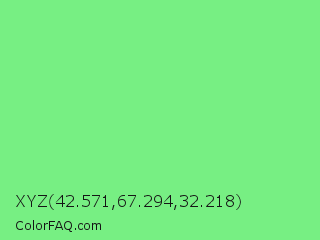 XYZ 42.571,67.294,32.218 Color is a light green color and the nearest color is Very Light Malachite Green #64e986. Hex code #77ef83 and RGB value is rgb(119,239,131). In RGB color space, this color is composed of 47% red, 94% green, 51% blue, In CMYK color space, this color is composed of 50% cyan, 0% magenta, 45% yellow , 6% black , In HSL color space, this color has a hue angle of 126° , 79% saturation and 70% lightness.