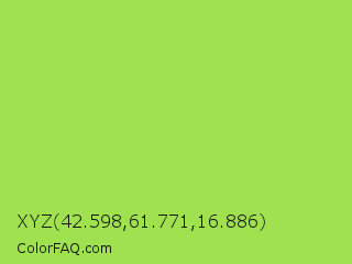 XYZ 42.598,61.771,16.886 Color is a normal green color and the nearest color is Conifer #acdd4d. Hex code #9fe14e and RGB value is rgb(159,225,78). In RGB color space, this color is composed of 62% red, 88% green, 31% blue, In CMYK color space, this color is composed of 29% cyan, 0% magenta, 65% yellow , 12% black , In HSL color space, this color has a hue angle of 87° , 71% saturation and 59% lightness.