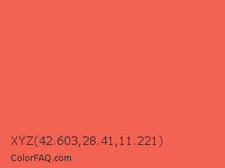 XYZ 42.603,28.41,11.221 Color is a light red color and the nearest color is Sunset Orange #fd5e53. Hex code #f26352 and RGB value is rgb(242,99,82). In RGB color space, this color is composed of 95% red, 39% green, 32% blue, In CMYK color space, this color is composed of 0% cyan, 59% magenta, 66% yellow , 5% black , In HSL color space, this color has a hue angle of 6° , 86% saturation and 64% lightness.