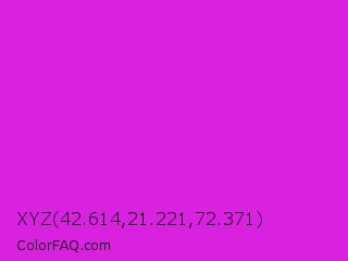 XYZ 42.614,21.221,72.371 Color is a normal magenta color and the nearest color is Steel Pink #cc33cc. Hex code #d921e0 and RGB value is rgb(217,33,224). In RGB color space, this color is composed of 85% red, 13% green, 88% blue, In CMYK color space, this color is composed of 3% cyan, 85% magenta, 0% yellow , 12% black , In HSL color space, this color has a hue angle of 298° , 75% saturation and 50% lightness.