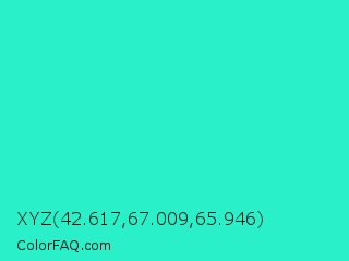 XYZ 42.617,67.009,65.946 Color is a normal cyan color and the nearest color is Turquoise PWG #30d5c8. Hex code #29f0c9 and RGB value is rgb(41,240,201). In RGB color space, this color is composed of 16% red, 94% green, 79% blue, In CMYK color space, this color is composed of 83% cyan, 0% magenta, 16% yellow , 6% black , In HSL color space, this color has a hue angle of 168° , 87% saturation and 55% lightness.