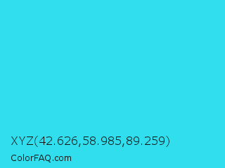 XYZ 42.626,58.985,89.259 Color is a normal cyan color and the nearest color is Turquoise #40e0d0. Hex code #30deed and RGB value is rgb(48,222,237). In RGB color space, this color is composed of 19% red, 87% green, 93% blue, In CMYK color space, this color is composed of 80% cyan, 6% magenta, 0% yellow , 7% black , In HSL color space, this color has a hue angle of 185° , 84% saturation and 56% lightness.