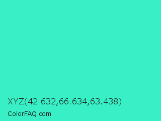XYZ 42.632,66.634,63.438 Color is a normal cyan color and the nearest color is Turquoise #40e0d0. Hex code #39efc5 and RGB value is rgb(57,239,197). In RGB color space, this color is composed of 22% red, 94% green, 77% blue, In CMYK color space, this color is composed of 76% cyan, 0% magenta, 18% yellow , 6% black , In HSL color space, this color has a hue angle of 166° , 85% saturation and 58% lightness.