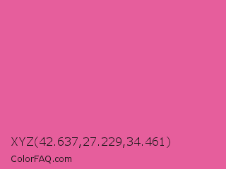 XYZ 42.637,27.229,34.461 Color is a light rose color and the nearest color is Raspberry Pink #e25098. Hex code #e65e9c and RGB value is rgb(230,94,156). In RGB color space, this color is composed of 90% red, 37% green, 61% blue, In CMYK color space, this color is composed of 0% cyan, 59% magenta, 32% yellow , 10% black , In HSL color space, this color has a hue angle of 333° , 73% saturation and 64% lightness.