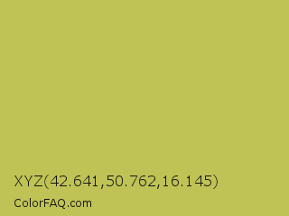 XYZ 42.641,50.762,16.145 Color is a normal yellow color and the nearest color is Celery #b8c25d. Hex code #bfc355 and RGB value is rgb(191,195,85). In RGB color space, this color is composed of 75% red, 76% green, 33% blue, In CMYK color space, this color is composed of 2% cyan, 0% magenta, 56% yellow , 24% black , In HSL color space, this color has a hue angle of 62° , 48% saturation and 55% lightness.
