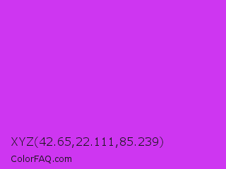 XYZ 42.65,22.111,85.239 Color is a normal purple color and the nearest color is Steel Pink #cc33cc. Hex code #ce36f1 and RGB value is rgb(206,54,241). In RGB color space, this color is composed of 81% red, 21% green, 95% blue, In CMYK color space, this color is composed of 15% cyan, 78% magenta, 0% yellow , 5% black , In HSL color space, this color has a hue angle of 289° , 87% saturation and 58% lightness.