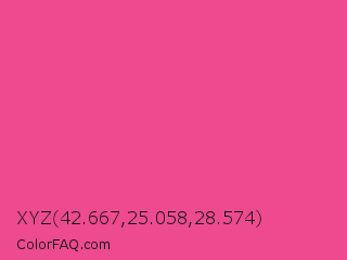 XYZ 42.667,25.058,28.574 Color is a light rose color and the nearest color is French Rose #f64a8a. Hex code #ee4a8f and RGB value is rgb(238,74,143). In RGB color space, this color is composed of 93% red, 29% green, 56% blue, In CMYK color space, this color is composed of 0% cyan, 69% magenta, 40% yellow , 7% black , In HSL color space, this color has a hue angle of 335° , 83% saturation and 61% lightness.