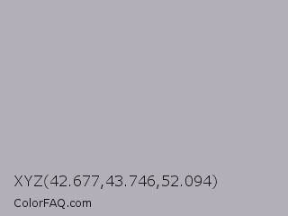XYZ 42.677,43.746,52.094 Color is a light violet color and the nearest color is Bombay #afb1b8. Hex code #b3afb9 and RGB value is rgb(179,175,185). In RGB color space, this color is composed of 70% red, 69% green, 73% blue, In CMYK color space, this color is composed of 3% cyan, 5% magenta, 0% yellow , 27% black , In HSL color space, this color has a hue angle of 264° , 7% saturation and 71% lightness.