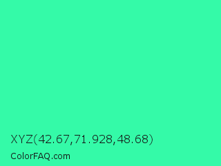 XYZ 42.67,71.928,48.68 Color is a normal green color and the nearest color is Eucalyptus #44d7a8. Hex code #34faa8 and RGB value is rgb(52,250,168). In RGB color space, this color is composed of 20% red, 98% green, 66% blue, In CMYK color space, this color is composed of 79% cyan, 0% magenta, 33% yellow , 2% black , In HSL color space, this color has a hue angle of 155° , 95% saturation and 59% lightness.