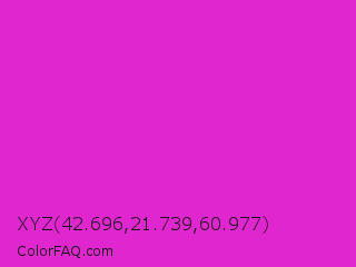 XYZ 42.696,21.739,60.977 Color is a normal magenta color and the nearest color is Steel Pink #cc33cc. Hex code #e026cf and RGB value is rgb(224,38,207). In RGB color space, this color is composed of 88% red, 15% green, 81% blue, In CMYK color space, this color is composed of 0% cyan, 83% magenta, 8% yellow , 12% black , In HSL color space, this color has a hue angle of 305° , 75% saturation and 51% lightness.
