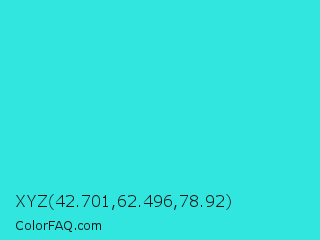 XYZ 42.701,62.496,78.92 Color is a normal cyan color and the nearest color is Turquoise #40e0d0. Hex code #30e6de and RGB value is rgb(48,230,222). In RGB color space, this color is composed of 19% red, 90% green, 87% blue, In CMYK color space, this color is composed of 79% cyan, 0% magenta, 3% yellow , 10% black , In HSL color space, this color has a hue angle of 177° , 78% saturation and 55% lightness.