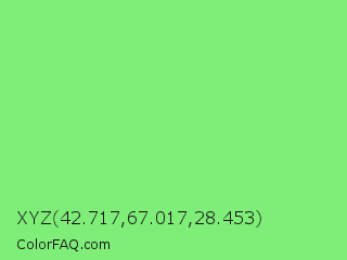 XYZ 42.717,67.017,28.453 Color is a light green color and the nearest color is Pastel Green #77dd77. Hex code #7fee78 and RGB value is rgb(127,238,120). In RGB color space, this color is composed of 50% red, 93% green, 47% blue, In CMYK color space, this color is composed of 47% cyan, 0% magenta, 50% yellow , 7% black , In HSL color space, this color has a hue angle of 116° , 78% saturation and 70% lightness.
