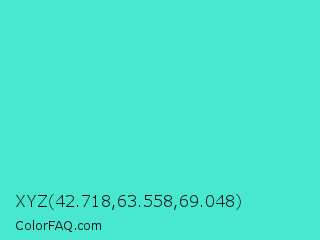 XYZ 42.718,63.558,69.048 Color is a normal cyan color and the nearest color is Turquoise #40e0d0. Hex code #47e8cf and RGB value is rgb(71,232,207). In RGB color space, this color is composed of 28% red, 91% green, 81% blue, In CMYK color space, this color is composed of 69% cyan, 0% magenta, 11% yellow , 9% black , In HSL color space, this color has a hue angle of 171° , 78% saturation and 59% lightness.